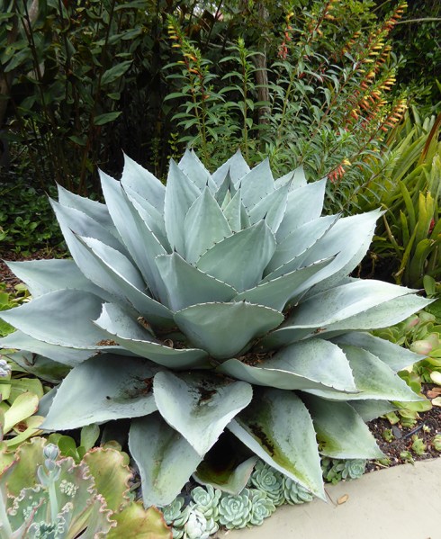 Reaching around 6′ across, brilliantly blue Agave ovatifolia “Whale’s Tongue Agave” is exceptionally hardy – down to USDA zone 7b!