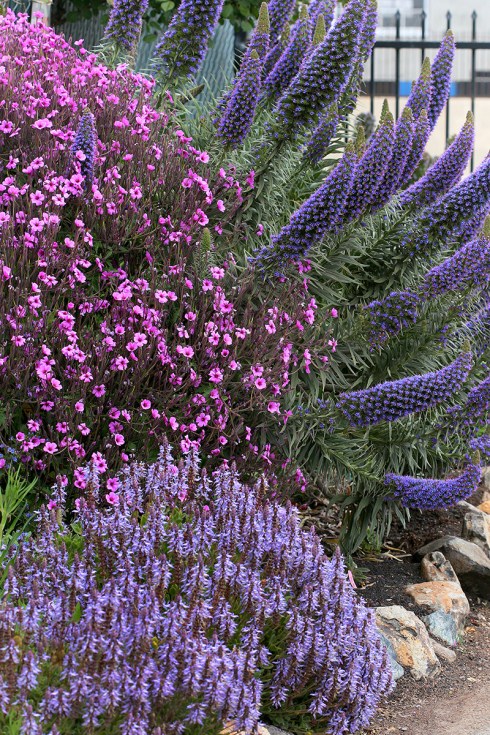 Echiums are famous for three things: being tough and drought tolerant, having exceptionally pretty blue, purple or pink flowers and for being absolute bee and hummingbird magnets. Add to that list the fact that deer dislike their tough, bristly leaves and we have a winner for the dry or xeric garden.