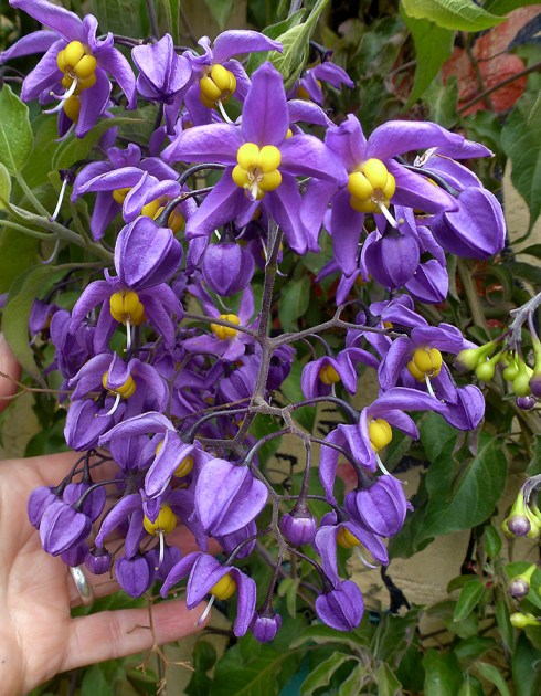 Massive wisteria-like clusters of glittery purple blooms cascade off vining Solanum valerianum ‘Navidad, Jalisco’.