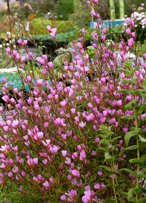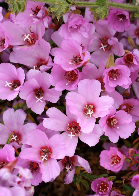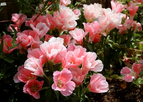 ‘Pink Ribbons’ is a named cultivar of “Red Ribbons”, the common name for C. concinna. Billowing over the edge of a bed or container, the flowers of ‘Pink Ribbons’ look like a mass of silky, brightest rose butterflies gathering over the bushy, slightly sprawling 12″ x 18″ mound of slender foliage and shiny red stems. Up close the 1.25″ flowers resemble flaring pinwheels or fans, with each of the four widely spaced petals trilobed in shape. Endemic almost entirely to Northern California, this delightful Clarkia is one of the earliest bloomers beginning in April and lasting thru July. I like to plant it near the front of a bed where you can enjoy the butterflies close up.