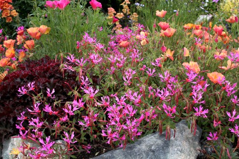 Here at the nursery we don’t have a garden devoted to only native plants. Though Clarkias are beautiful planted in groups or even singly, free to stretch out and reach their natural form and glory, I mix our most popular species into my cottage-y gardens with great success. They make perfect long-blooming fillers that keep pumping out blooms as other nearby plants go in and out of flower. (Cut-and-bloom tip: Clarkias bloom from the bottom upward along the stem; when cutting stems for cut flowers, always cut below the lowest bloom to encourage the plant to send up a new shoot and bloom again.)